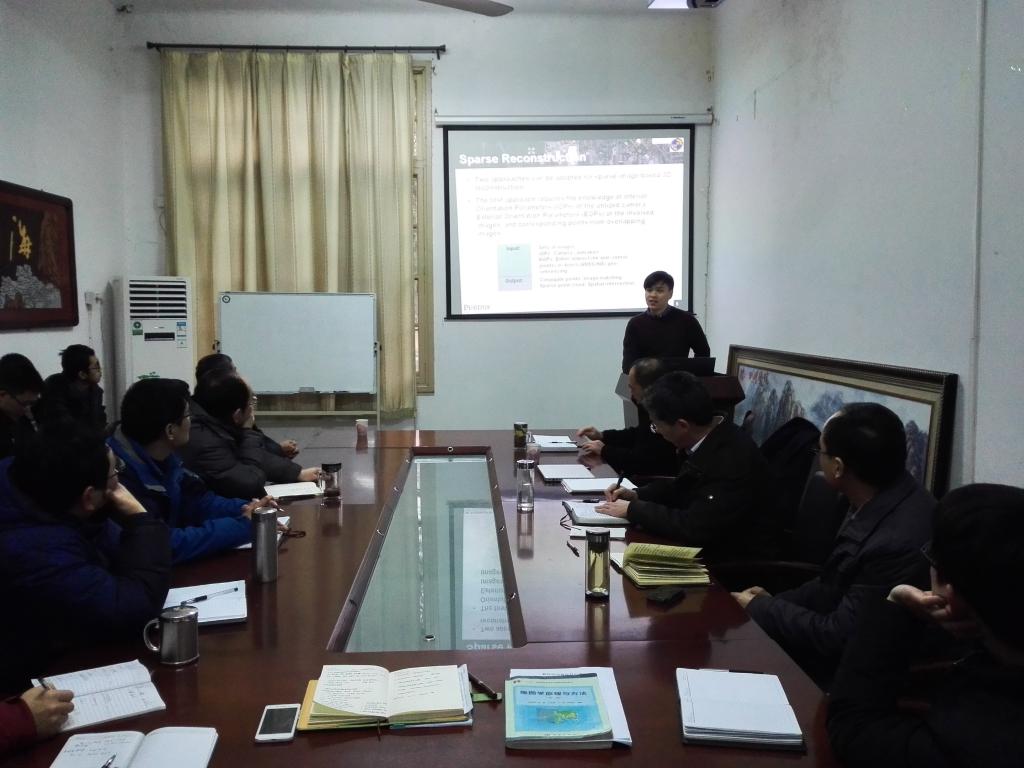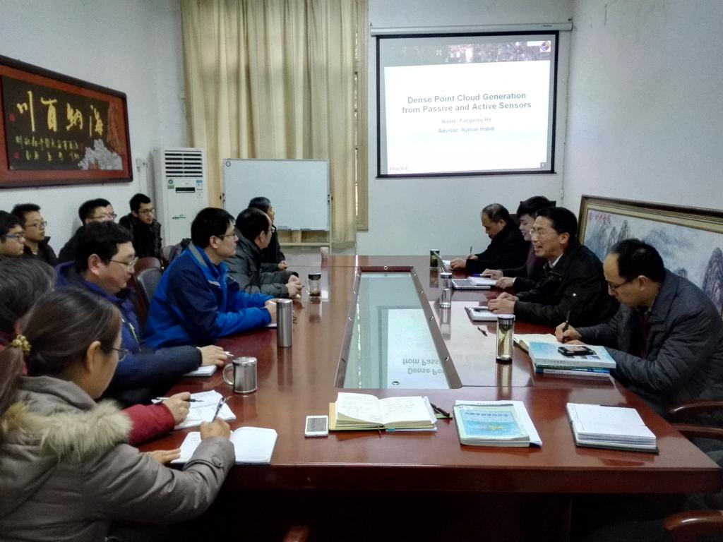 座谈会上,何方宁以 “Dense Point Cloud Generation from Passive and Active Sensors”为题,介绍了密集点云数据的获取途径、配准方法和流程,以及在建筑物和农作物估产中的应用。之后,与会人员就密集点云数据采集、计算方法、中美研究生教育差异等问题进行了深入讨论和交流。