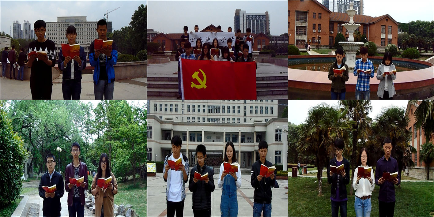 学生党员高声朗读党章,在树荫下,在教学楼旁,在党旗下,党员们宣读的身影认真、严谨,作为一名党员的责任感、使命感油然而生。