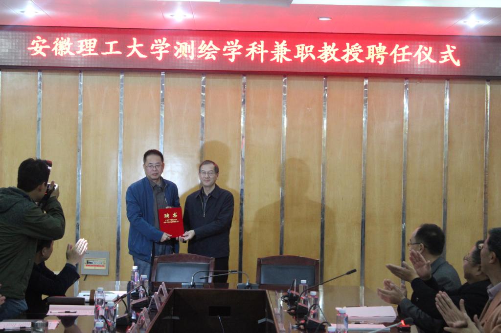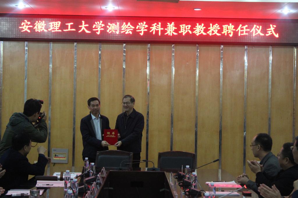 在兼职教授聘任阶段会议中,殷志祥处长代表学校首先宣读了关于聘任安徽省测绘局副局长张耀波教授级高工、安徽省第一测绘院院长张迁教授级高工为测绘科学技术学科兼职教授的决定;徐良骥副院长介绍了张耀波、张迁同志的简历;王其东校长给张耀波、张迁同志颁发兼职教授聘任证书。聘任仪式结束后,张耀波、张迁两位兼职教授发言中表示将会认真履行兼职教授职责,在人才培养、学科建设、科研合作等方面为我校测绘学科发展积极贡献自己的力量,积极推动老王论坛