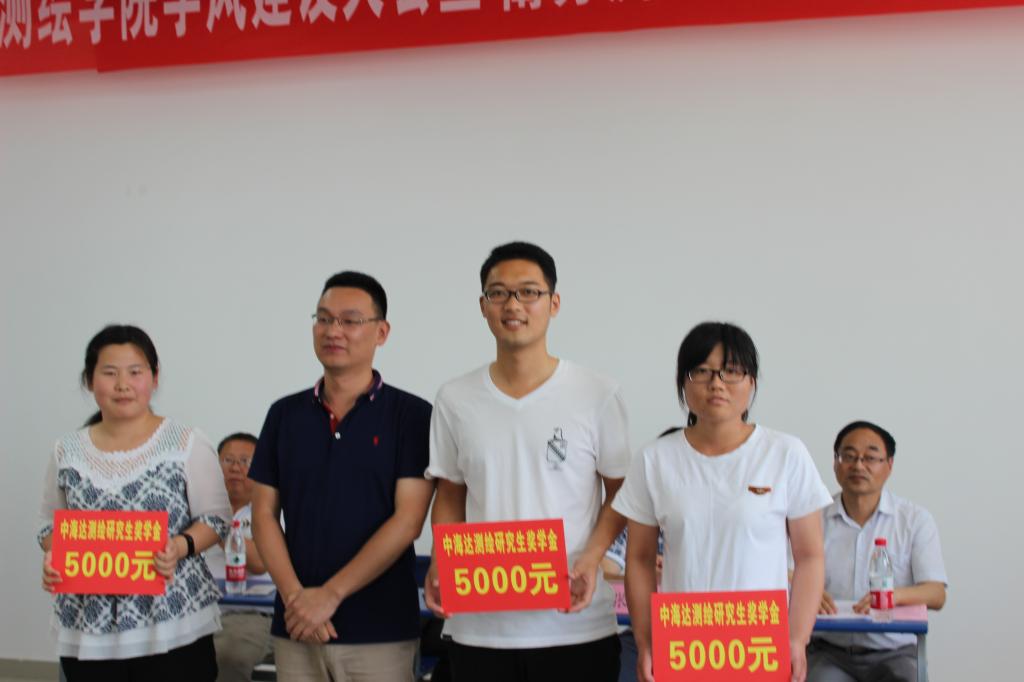 邾凯为获得中海达本科生奖学金、中海达研究生奖学金的同学颁奖;张军为获得南方测绘学习进步奖、帮扶奖学生颁奖。