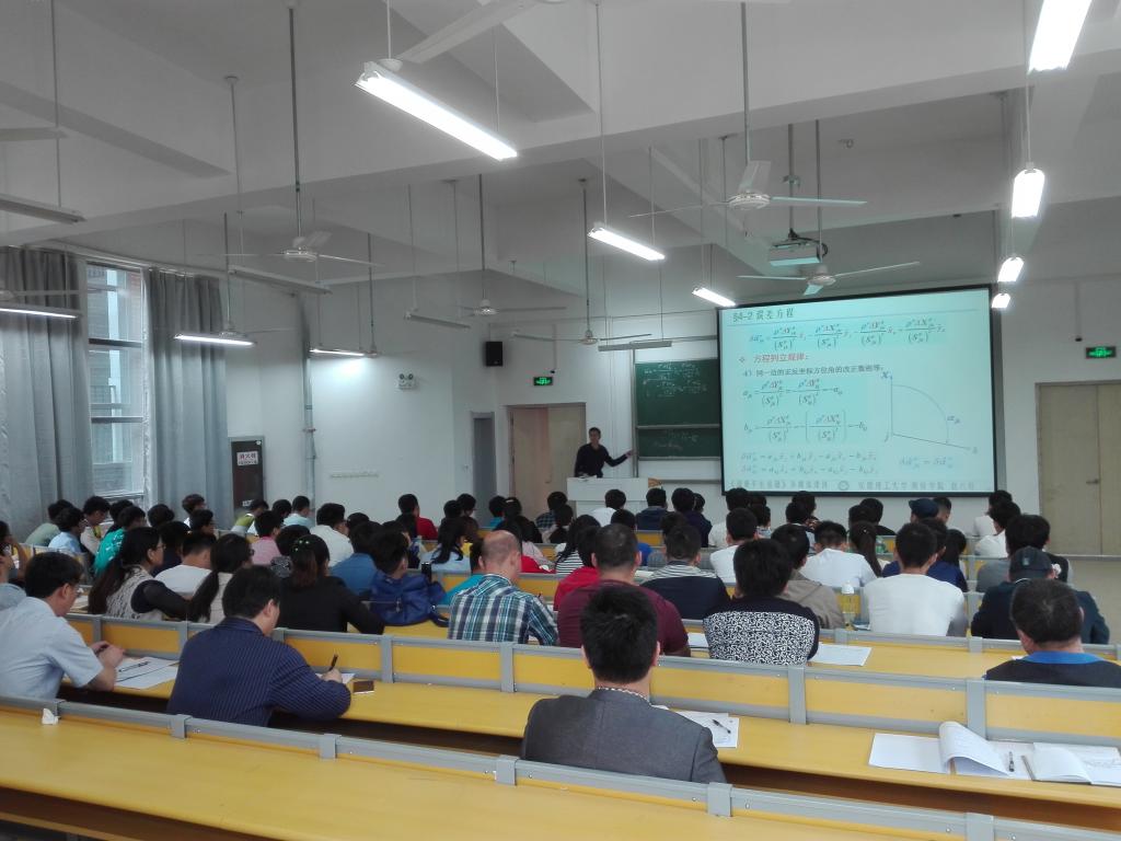 本次示范课为赵兴旺老师主讲的《测量平差基础》,授课对象为测绘工程专业2015级四个班的116名同学。课前,赵兴旺播放了视频短片《测绘人之歌》。开始上课后,赵兴旺用15分钟时间带领学生回顾了上节课所学内容,随后开始讲解新内容:测角网误差方程的列立和平差值方程。上课过程中,赵兴旺PPT和板书相结合,并不时提问,与学生互动,课堂效果良好。