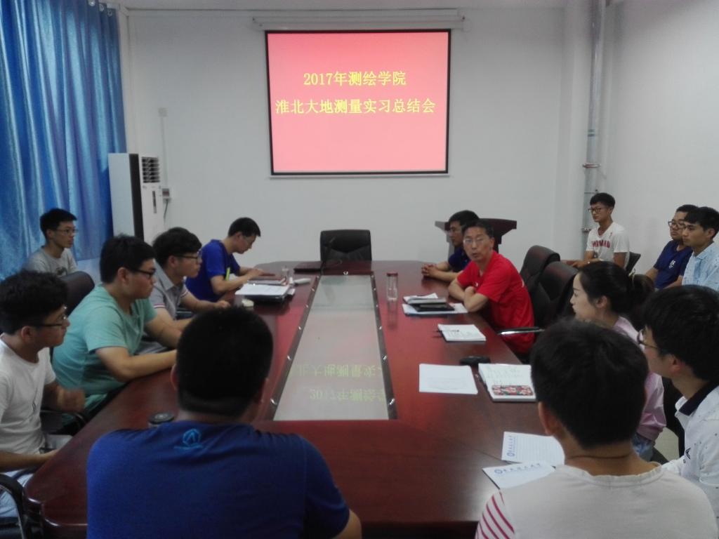 楼南402会议室召开2017年淮北大地测量实习总结座谈会,就实习中遇到的问题以及比较好的做法和经验进行总结,并就如何改进以后的实习进行讨论。院长赵志根主持会议,测绘工程系主任、实习带队教师、老王论坛