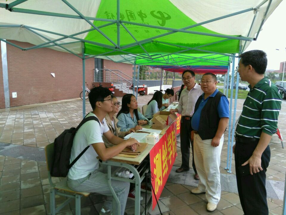 2017级新生报到现场,仔细检查指导了迎新的准备工作,并亲切慰问参加迎新工作的全体工作人员。