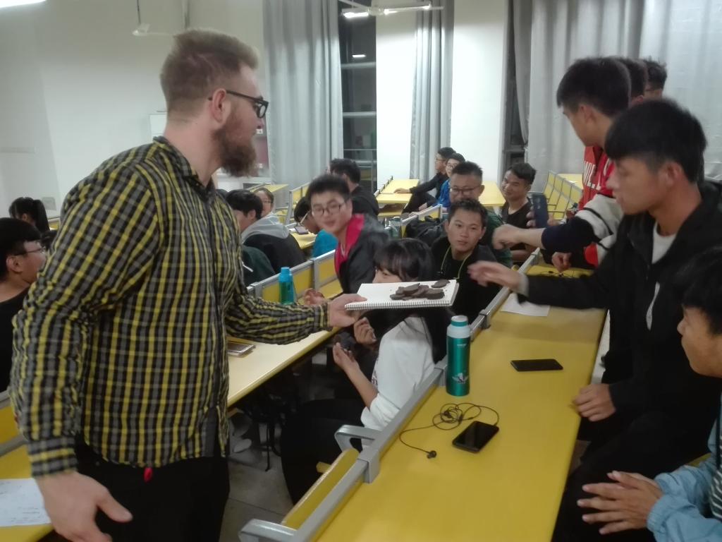 交流会分两部分:PPT介绍和互动交流。首先,Björn Eike Marx和Jannis Killian Marx向同学们介绍了德国的饮食、起居和生活习惯,以及他们在中国生活期间的感受,并比较了中德文化的差异。交流环节,Marx兄弟向同学们分发了德式面包、巧克力和糖果,张坤鼓励同学们大胆开口说英语,交朋友,同学们逐一用英语发言,并进行自我介绍。交流会结束时,Marx兄弟与同学们进行了合影。
