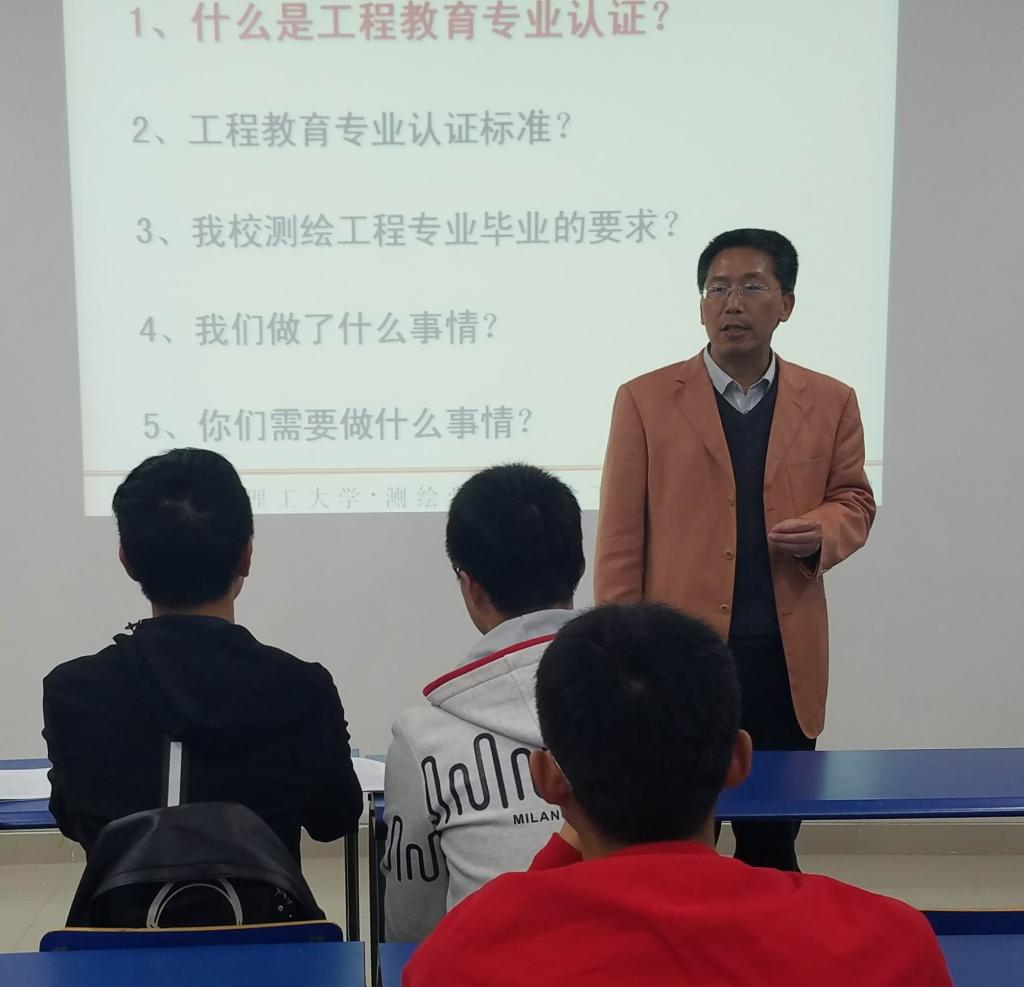 宣讲会上,赵兴旺从“工程教育专业认证背景”、“工程教育专业认证标准”、“测绘工程专业的毕业要求”、“我们做了什么事情”、“我们今后要怎么做”五个方面进行了宣讲,介绍了专业认证的基本知识、我国加入《华盛顿协议》的重要意义,分析了专业认证的通用标准和测绘工程专业的补充标准;同时,简要总结了测绘工程专业的基本情况,以及我校、测绘工程类高校参与专业认证的基本信息。