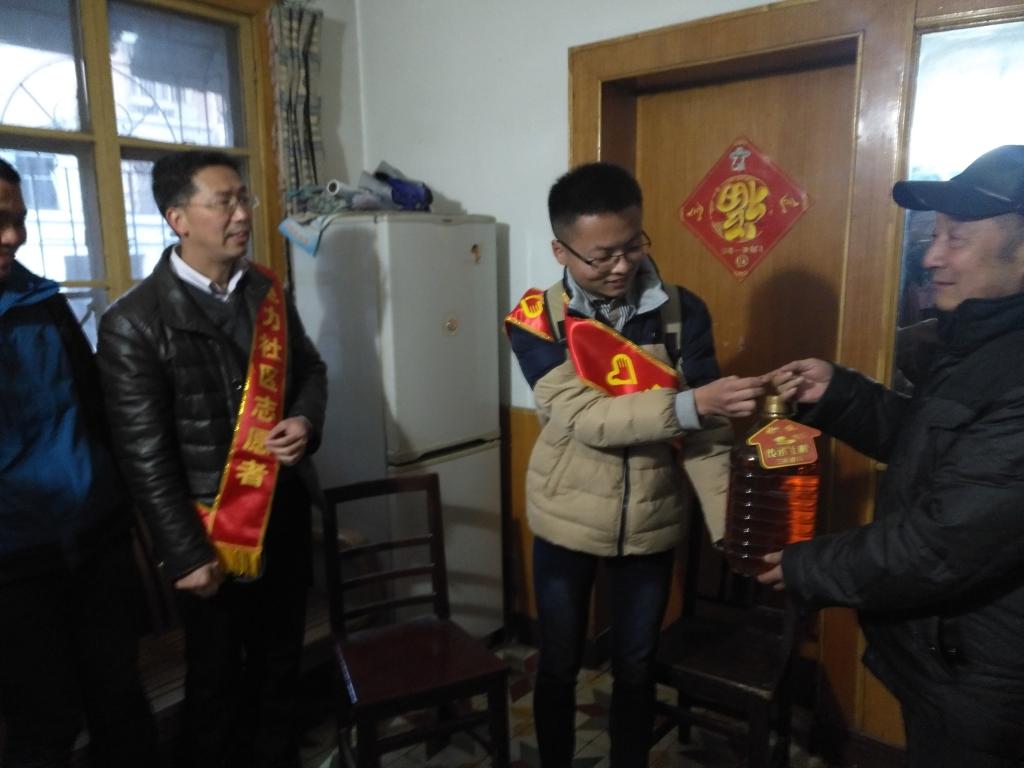 吴军一行带着油、米等生活必需品来到电力社区服务中心,在社区服务人员的带领下,开展社区志愿服务活动.志愿者们按照事先的活动安排,共分为三个志愿服务组,在吴军、赵志根等的组织下,对社区的贫困户、孤寡老人进行慰问,在这寒冬季节,将温暖送进困难群众家中。
