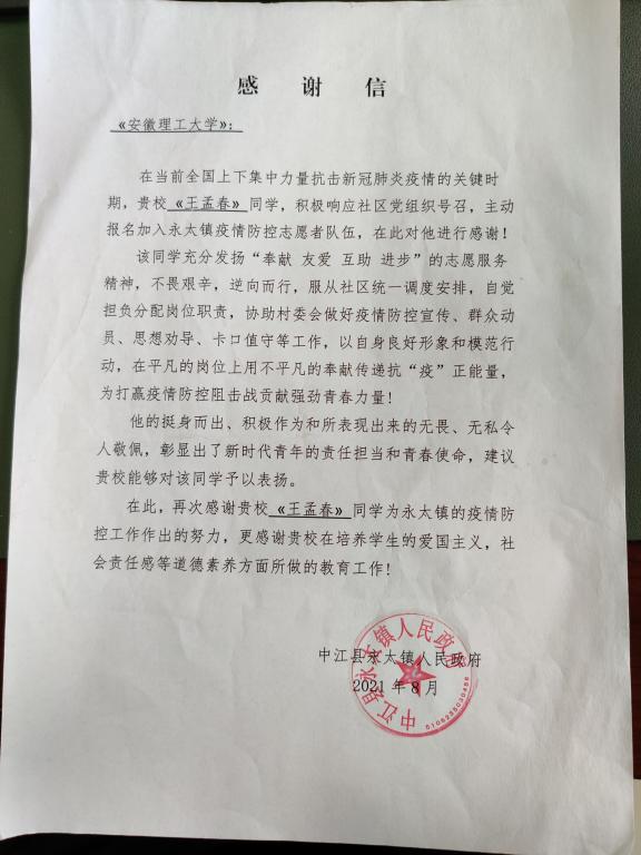 信中写道:“在当前全国上下集中力量抗击新冠肺炎疫情的关键时期,贵校王孟春同学积极响应社区党组织号召,主动报名加入永太镇疫情防控志愿者队伍,再次对他进行感谢!他的挺身而出、积极作为令人敬佩,彰显出了新时代青年的责任担当和青春使命,更感谢贵校在培养学生的爱国主义、社会责任感等道德素养方面所做的教育工作!”