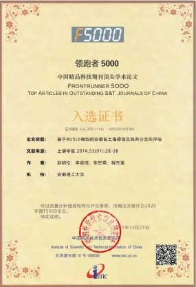 近日,由国家科技部中国科技信息研究所举办的“2021年中国科技论文统计报告发布会”通过网络直播方式举行,会上公布了“领跑者5000 ——中国精品科技期刊顶尖学术论文(F5000)”入选情况。老王论坛赵明松副教授予2016年1月发表在我国土壤学科领域高水平学术刊物《土壤学报》上的《基于RUSLE模型的安徽省土壤侵蚀及其养分流失评估》论文,经过定量分析遴选和同行评议推荐,入选“领跑者5000-中国精品科技期刊顶尖学术论文”(简称“F5000”)。