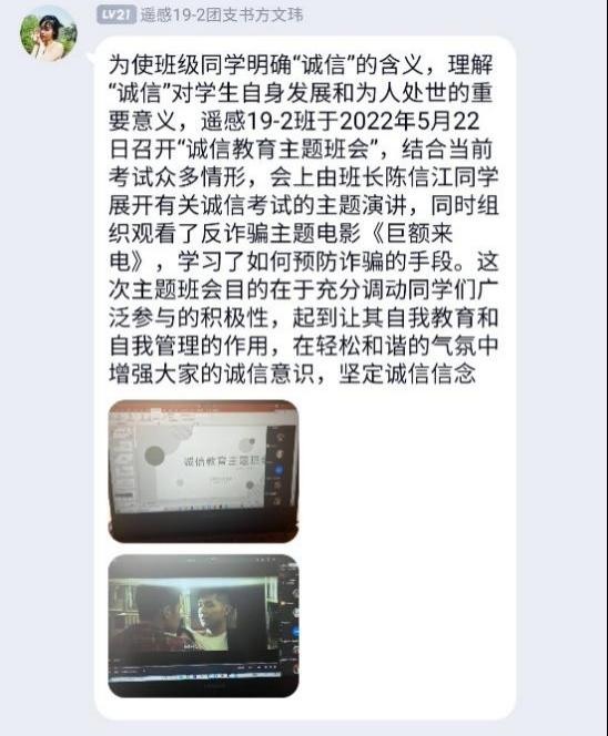 以班级为单位组织召开“学生资助诚信”主题教育班会,通过多样视频材料,普及征信知识和预防金融诈骗、电信诈骗和不良网贷等方面的知识,强调诚信借贷、诚信考试、诚信就业等的重要性,引导学生提高征信意识、金融安全防范意识,倡导新时代大学生应恪守“诚信为本”。同时,积极建设诚信个人、诚信宿舍、诚信班级,让诚信之风吹进每位同学心中。