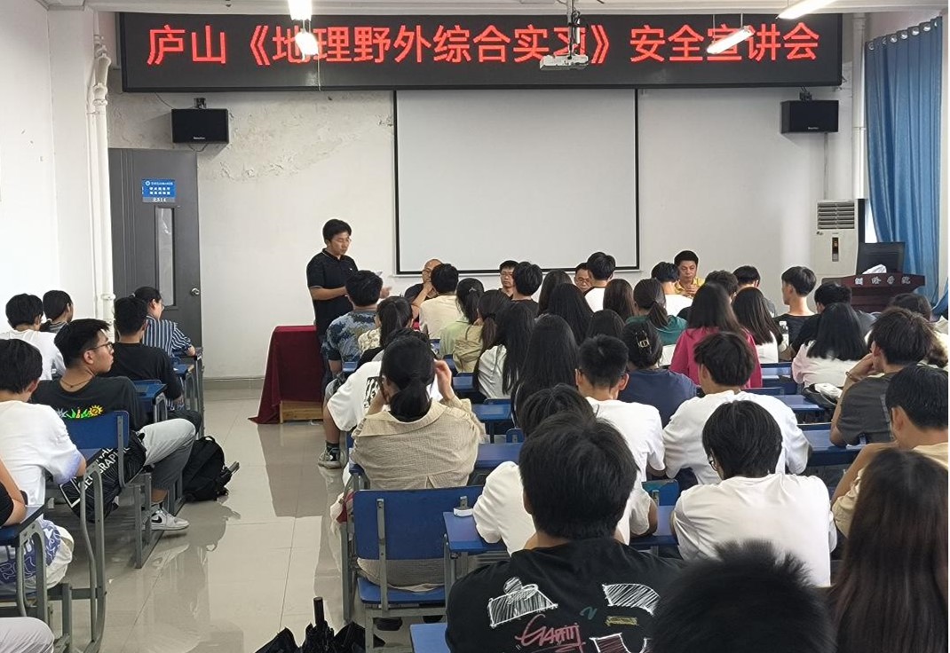 宣讲会上,系主任详细介绍了此次庐山野外实习的安排部署,全面解读了《地理野外综合实习》安全管理规定和《地理野外综合实习》安全风险告知承诺书,并要求参与本次实习的全体带队教师要绷紧安全这根弦,严格履行安全主体责任,做好安全防护和应急预案,确保实习工作安全开展。随后,实习主讲教师杨震介绍了实习的路线设计与内容安排,并对实习师生进行了安全培训。