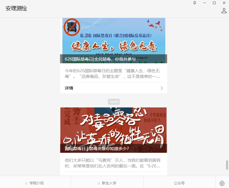 充分利用微信公众号“安理测绘”平台,围绕禁毒英雄事迹介绍和禁毒法规相关案例,图文并茂地向大学生普及毒品的种类及危害,同时宣传英雄事迹,感受先烈勇敢无畏、不屈不挠的禁毒精神,号召大家学习铭记。