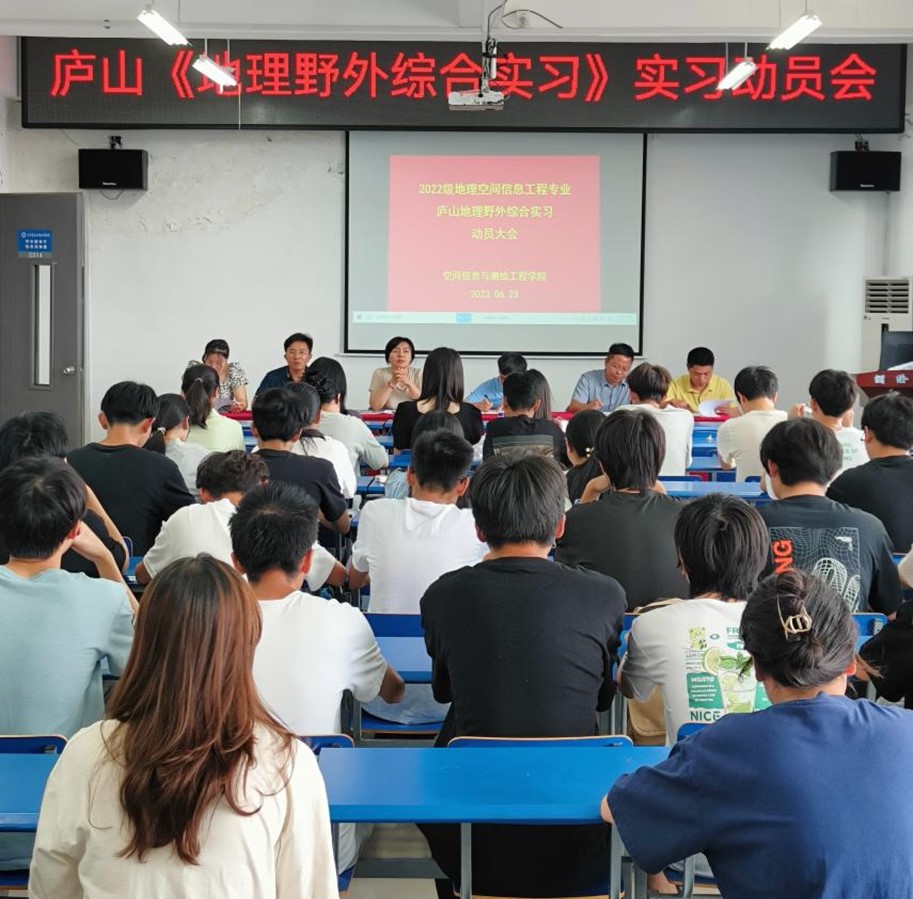 在北512报告厅召开《地理野外综合实习》实习动员会,院长余学祥教授、党委副书记孟静、副院长王磊教授、实习指导老师杨震和王世航、辅导员常凤姣、地理空间信息工程专业2022级全体同学参加动员会,动员会由王世航主持。